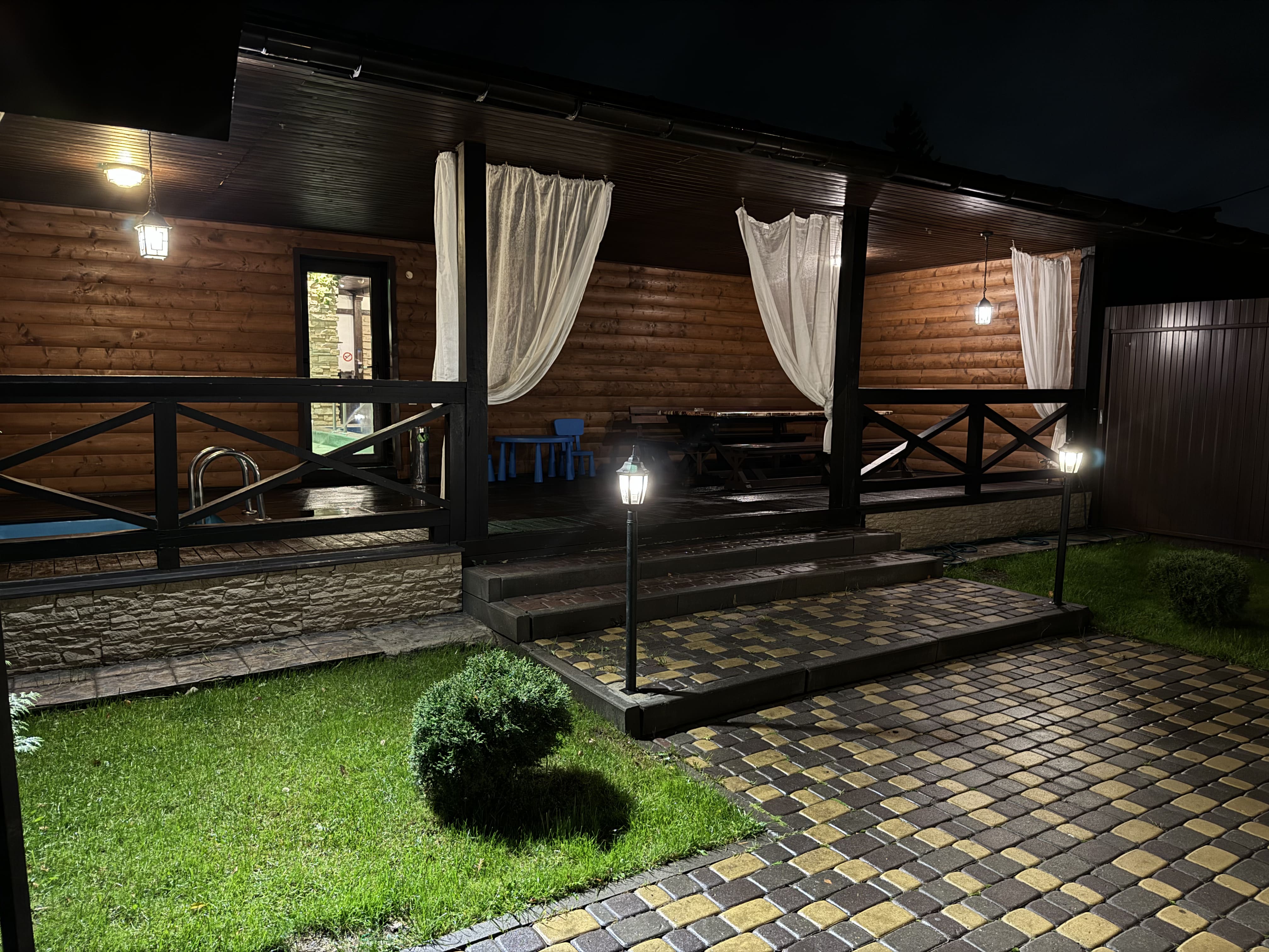 * отдельные благоустроенные дворики с верандой, качелями, мангалом и барбекю